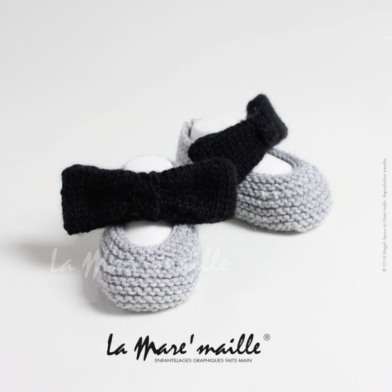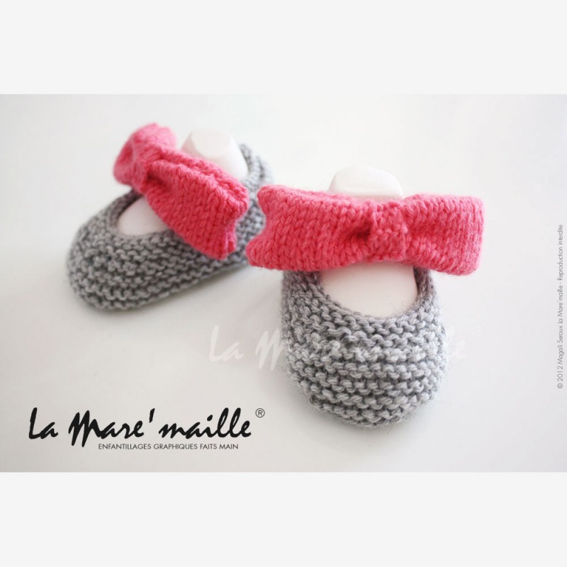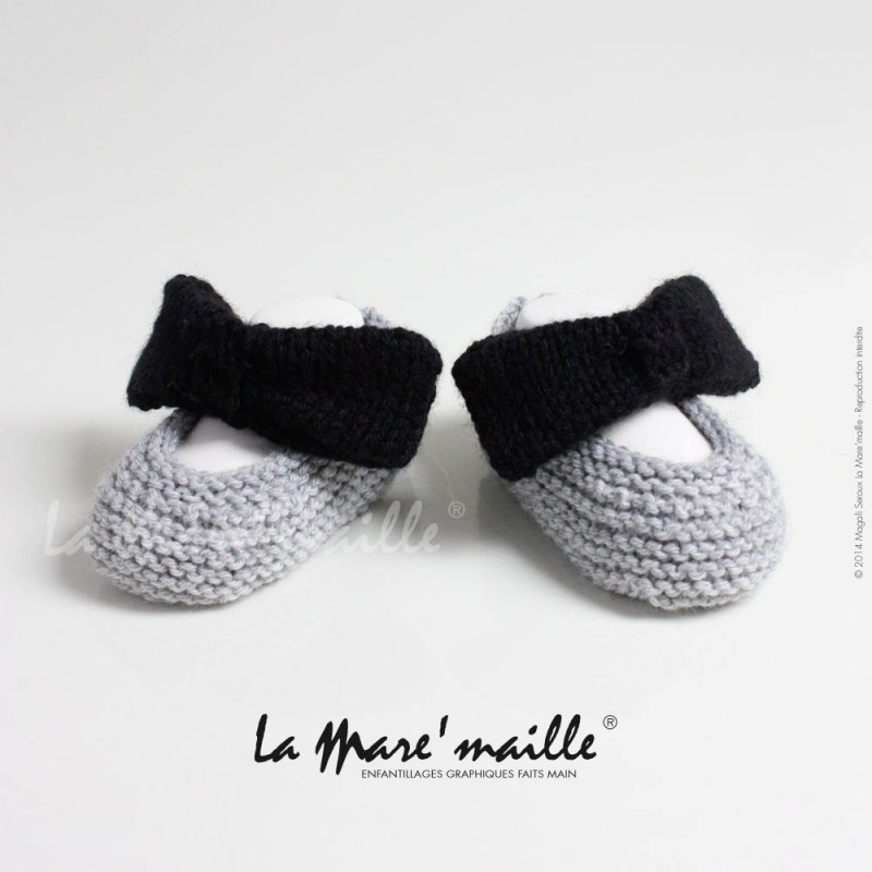 Quels adorables chaussons à offrir en cadeau de naissance à Bébé! Ces petites ballerines en laine gris clair, avec un gros nœud papillon fuchsia (faisant usage de bride) sont à la fois originales et rétros, elles ne passeront pas inaperçues!