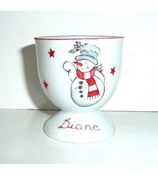 Coquetier en porcelaine décoré à la main d’un joli bonhomme de neige et de petites étoiles ! Une idée Cadeau pour Noël utile et unique car personnalisable au prénom de l’enfant, de quoi faire plaisir!