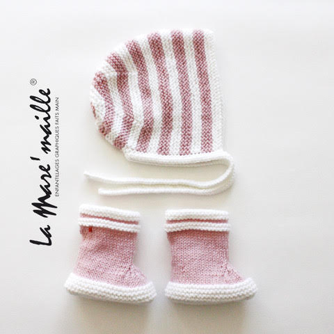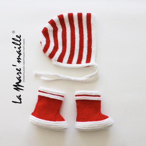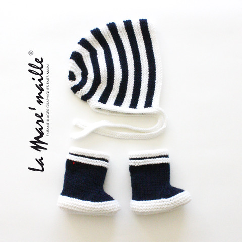 Adorable ensemble de naissance composé d’un bonnet marinière et de chaussons façon bottes de pluie, clin d’œil tendre à la célèbre marque Aigle. Ce duo au style rétro et plein de charme allie originalité et praticité, pour un cadeau de naissance à la fois tendance et plein d’humour. Une création unique signée La Mare’maille, réalisée avec l’aimable autorisation de la marque Aigle.