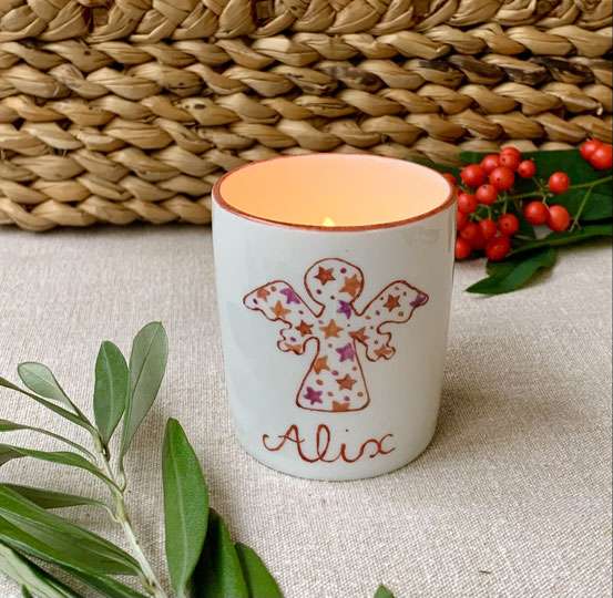 Le petit bougeoir « Ange étoilé » est une création en céramique peinte à la main, disponible en deux coloris et entièrement personnalisable.