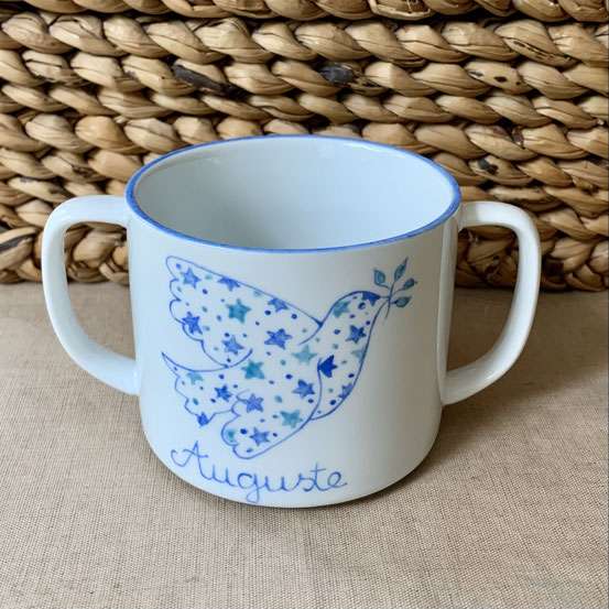 Cette tasse deux anses, façonnée en céramique et peinte à la main en France, célèbre la tendresse et la symbolique de la colombe étoilée. Idéale pour les tout-petits, elle combine praticité, sécurité et poésie.