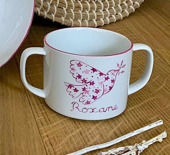 La tasse deux anses personnalisée « Colombe étoilée » apporte douceur et sérénité à chaque boisson. Peinte à la main, elle se personnalise avec prénom ou message pour un cadeau tendre et unique.
